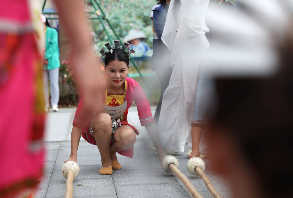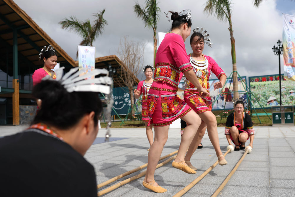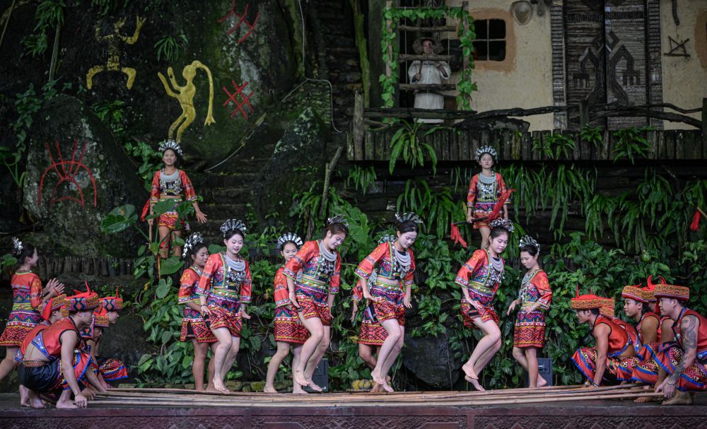 ↑2024年11月4日在位于海南保亭的檳榔谷文化旅游區拍攝的黎族打柴舞表演。