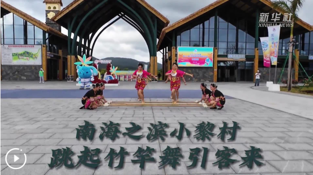 ↑11月25日,博后村村民在博后村亞龍灣國際玫瑰谷外的廣場上跳起竹竿舞,歡迎遠道而來的客人。????