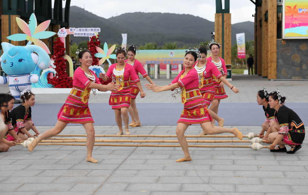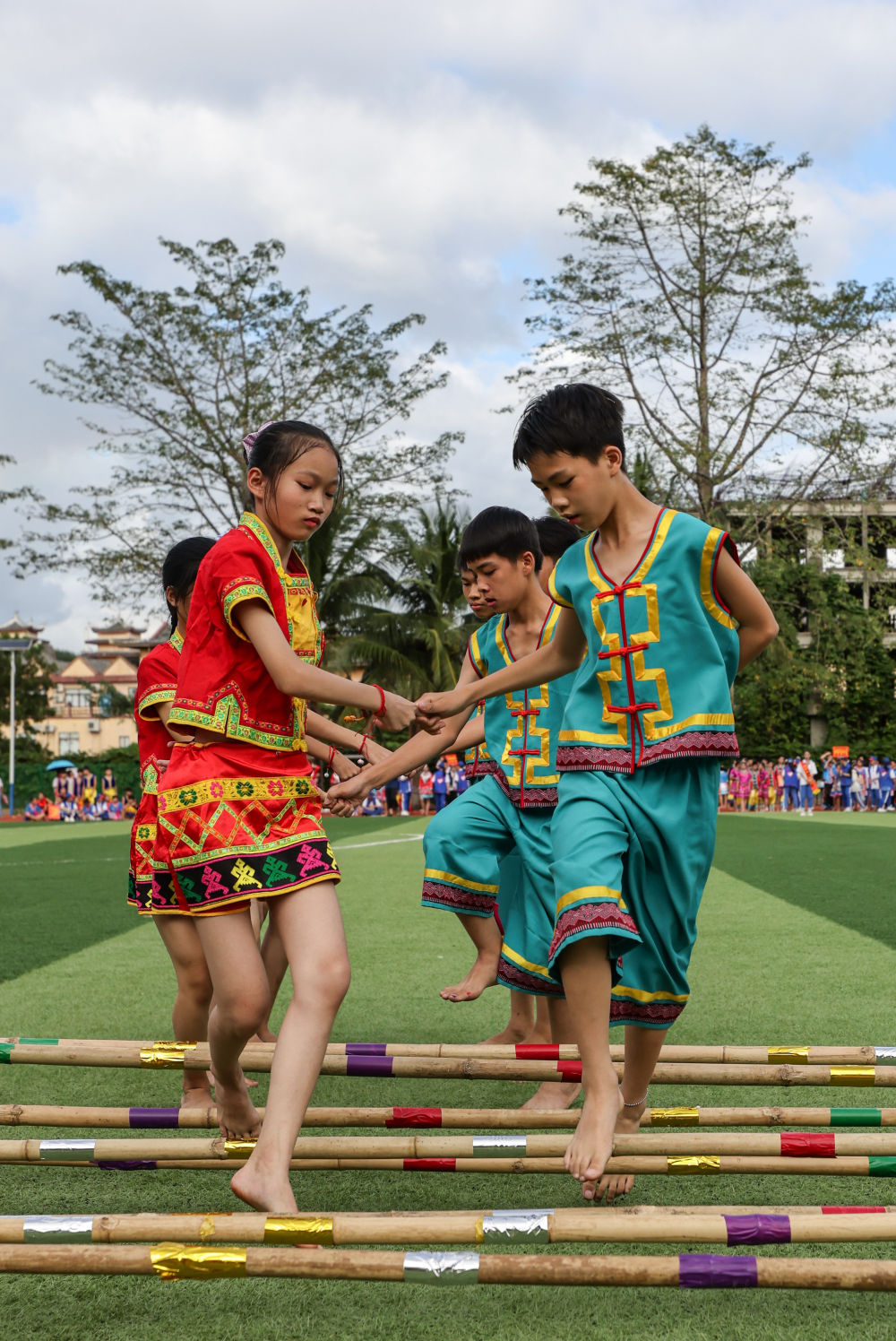 ↑2020年11月18日,一場竹竿舞比賽在海南保亭黎族苗族自治縣保亭中學舉行。