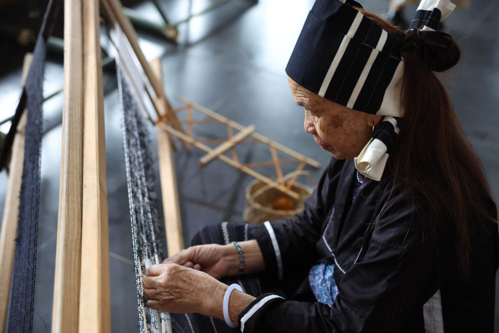 ↑11月25日,一名黎族老人在博后村編織棉線制作黎錦。??