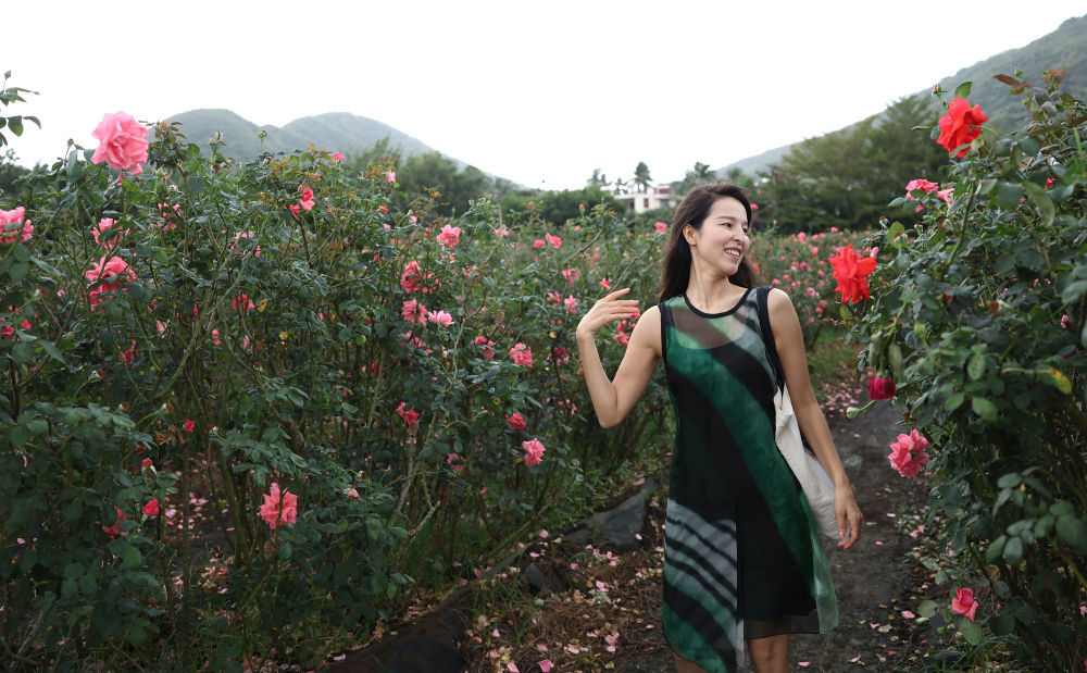 ↑11月25日,一名哈薩克族女士在博后村亞龍灣玫瑰谷游覽。??