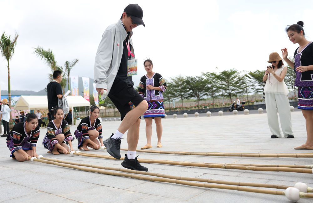 ↑貴州代表團成員在當地村民的帶領下跳起竹竿舞。??