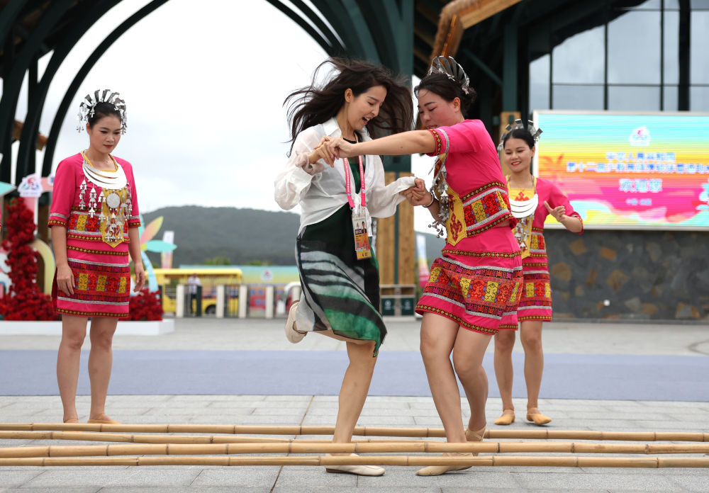 ↑一名福建代表團成員隨著歡快的韻律節奏跳起竹竿舞。???