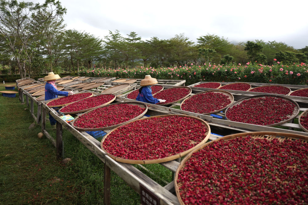 ↑11月25日,博后村村民在亞龍灣國際玫瑰谷晾曬可食用玫瑰花。