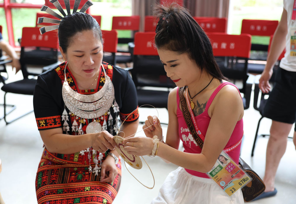 ↑11月25日,一名青海代表團成員(右)在博后村體驗黎族藤編技藝。??
