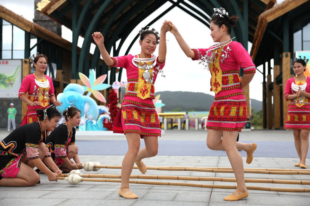 ↑2017年3月31日,演員在瓊中縣三月三廣場為觀眾表演竹竿舞。