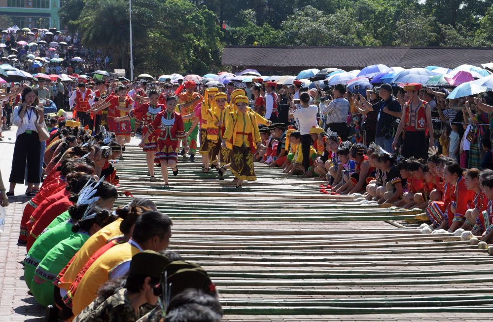 ↑2017年3月31日,海南省瓊中黎族苗族自治縣在三月三廣場舉行萬人竹竿舞展演,慶祝傳統節日“三月三”。??