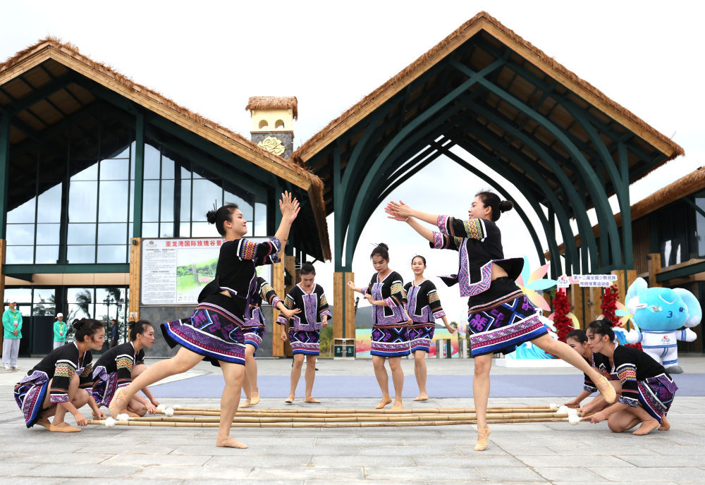 ↑11月25日,在三亞吉陽區博后村亞龍灣國際玫瑰谷外的廣場上,當地村民跳起竹竿舞,歡迎賓客的到來。