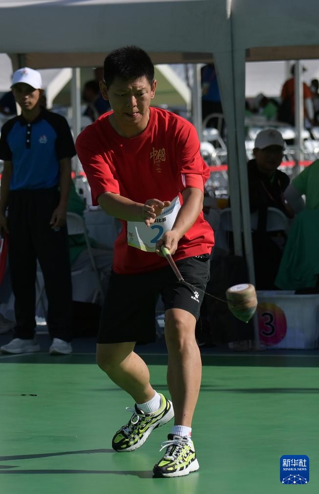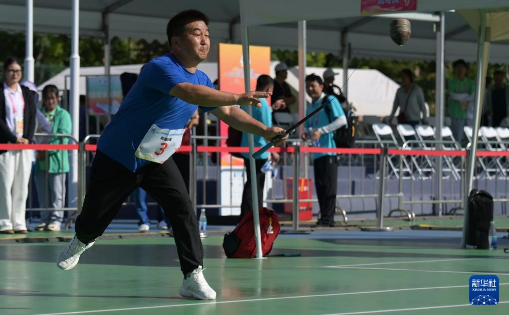 11月27日,安徽隊(duì)選手馬團(tuán)結(jié)(前)在比賽中投擲陀螺。