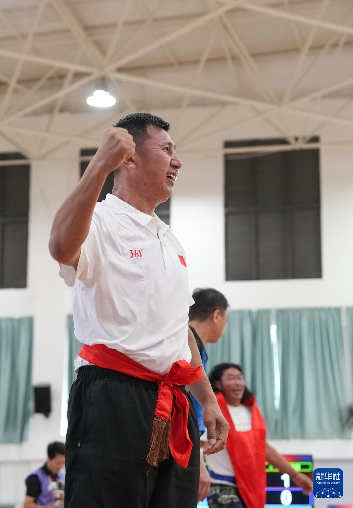 11月27日,新疆生產(chǎn)建設(shè)兵團隊選手提亞那克·黑沙別克在85公斤級半決賽中慶祝獲勝。他戰(zhàn)勝青海隊選手旦周才讓,晉級決賽。