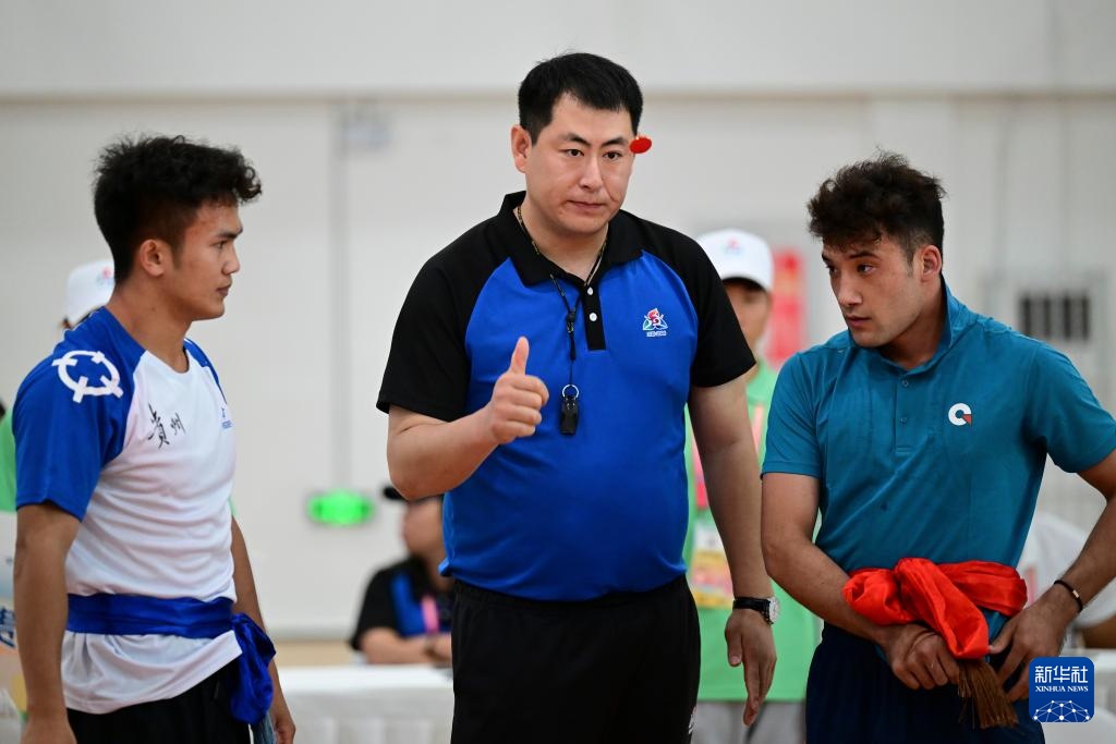 11月27日,新疆生產(chǎn)建設(shè)兵團隊選手海拉提別克·沙布爾別克在76公斤級半決賽中。他戰(zhàn)勝西藏隊選手旦真旺堆,晉級決賽。