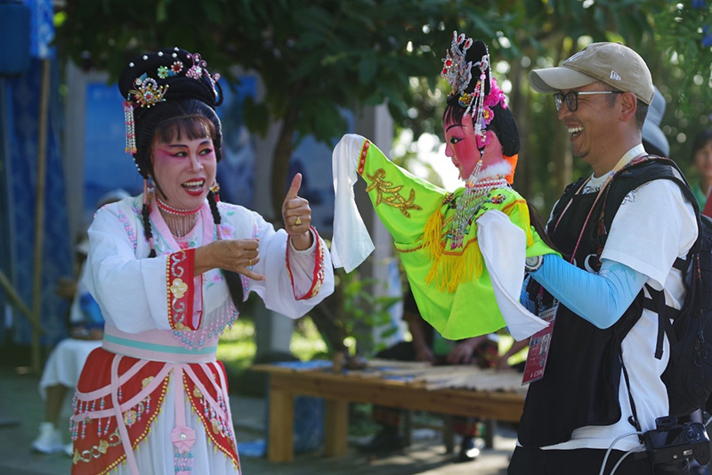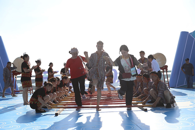 游客體驗竹竿舞。人民網記者 孟凡盛攝