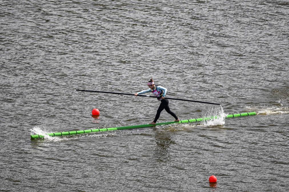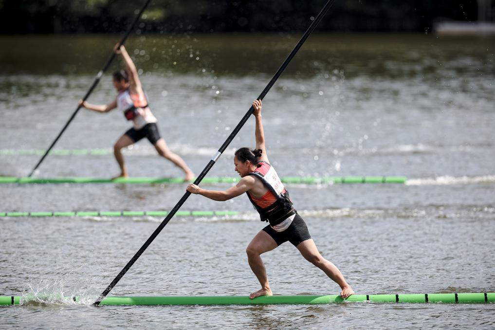 11月27日,云南隊選手陳良背(前)在決賽中,最終她獲得二等獎。當日,第十二屆全國少數民族傳統體育運動會獨竹漂女子組60米直道賽決賽在海南省三亞市舉行。新華社記者 江漢 攝