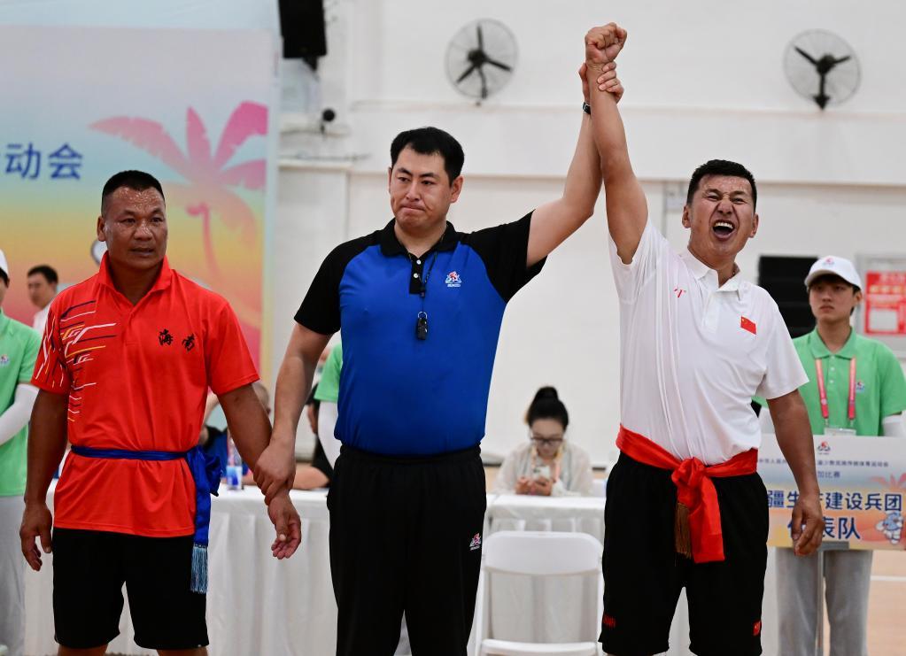 27日,第十二屆全國少數民族傳統體育運動會(以下簡稱“運動會”)押加比賽迎來五個組別的最終爭奪。新疆生產建設兵團選手提亞那克驚險取勝,獲得85公斤級一等獎。一場鏖戰后,他與來自海南的選手吉航敬擁抱致意。