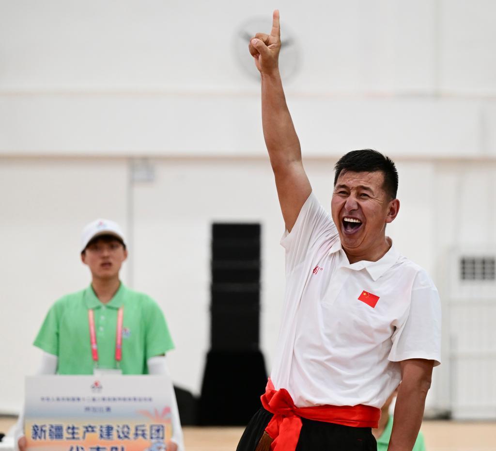 11月27日,新疆生產建設兵團選手提亞那克·黑沙別克在85公斤級決賽獲勝后慶祝。他戰勝海南隊選手吉航敬,獲得一等獎。新華社記者 周牧 攝