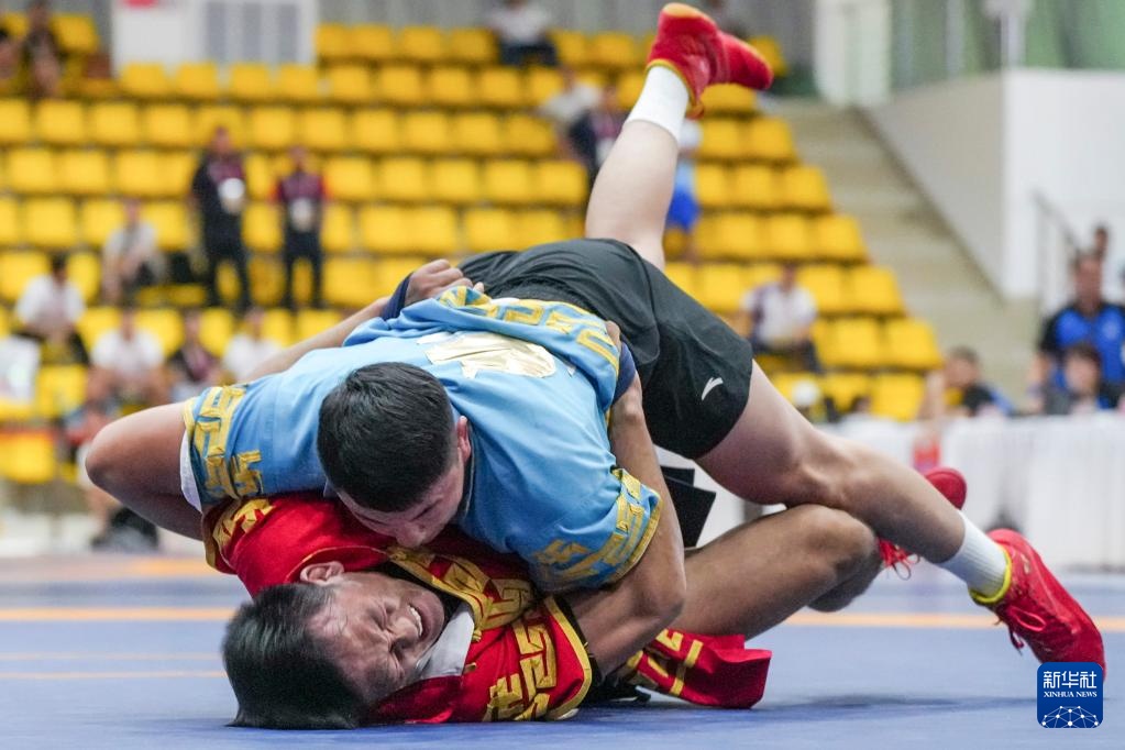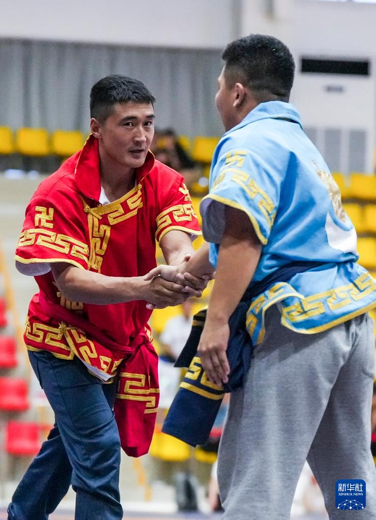 11月27日,遼寧隊(duì)選手那吉德(左)與山西隊(duì)選手達(dá)呼日巴乙拉在北嘎87公斤以上級(jí)決賽中。最終,那吉德戰(zhàn)勝達(dá)呼日巴乙拉,獲得一等獎(jiǎng)。