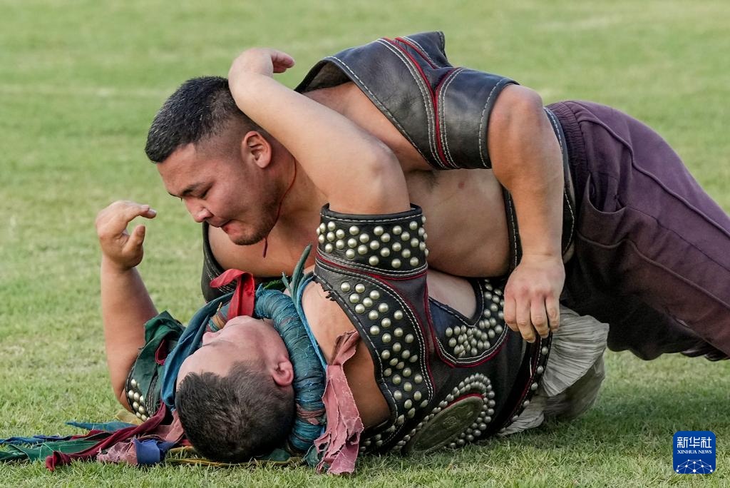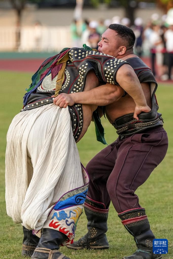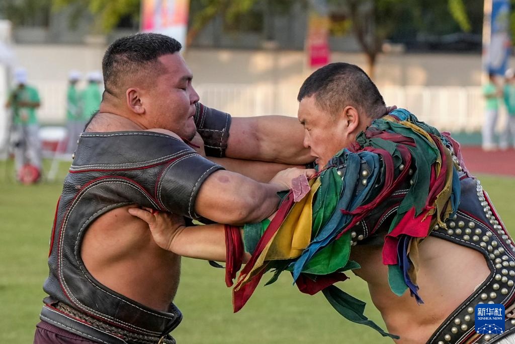 當日,第十二屆全國少數民族傳統體育運動會民族式摔跤搏克男子個人決賽在海南三亞舉行。