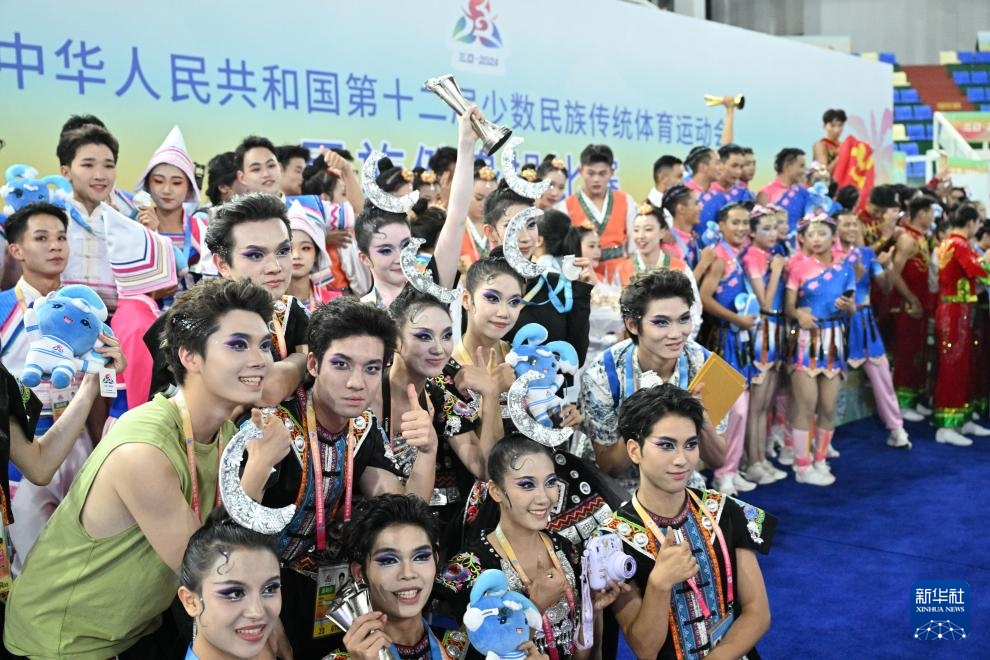 11月28日,這是第十二屆全國(guó)少數(shù)民族傳統(tǒng)體育運(yùn)動(dòng)會(huì)民族健身操規(guī)定套路+自選套路(輕器械)頒獎(jiǎng)儀式現(xiàn)場(chǎng)。最終,云南隊(duì)、吉林隊(duì)、海南隊(duì)獲得二等獎(jiǎng),西藏隊(duì)獲得一等獎(jiǎng),河北隊(duì)、湖北隊(duì)、遼寧隊(duì)、福建隊(duì)獲得三等獎(jiǎng)(從左至右)。
