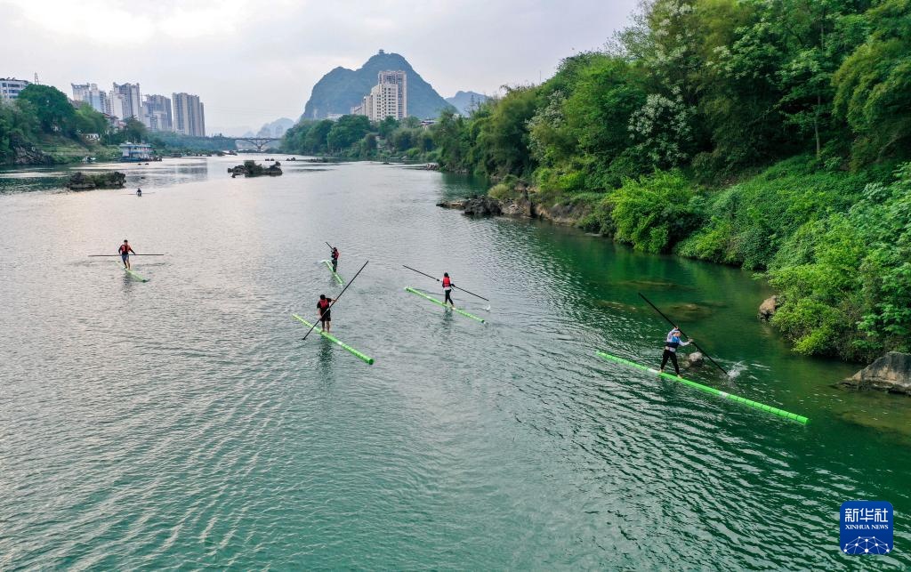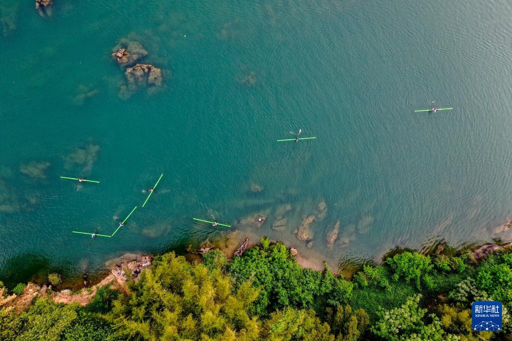 河池學院獨竹漂隊的隊員們在龍江河上訓練(無人機照片,2024年4月9日攝)。