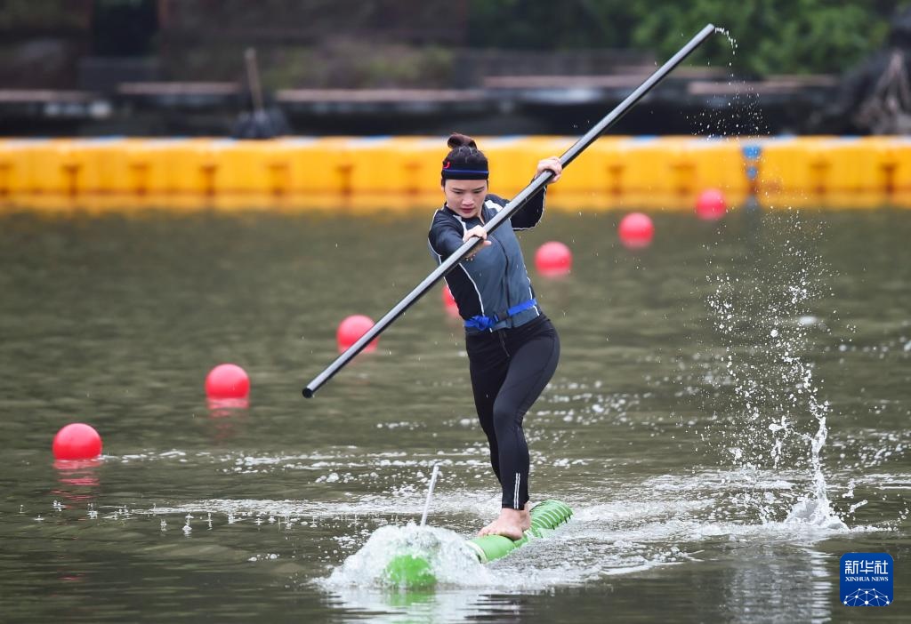 河池學院獨竹漂隊隊員陸春桃在廣西桂林市舉行的“民族體育炫”系列比賽中參加獨竹漂項目的比賽(2019年4月4日攝)。