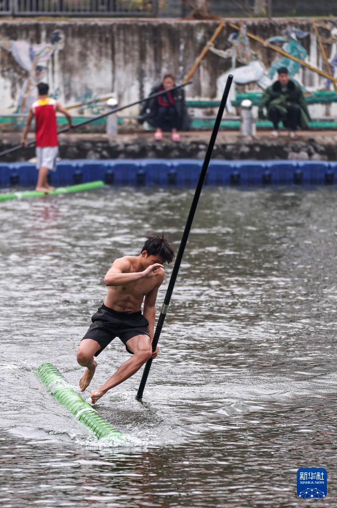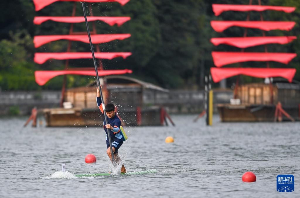 河池學院獨竹漂隊隊員王光向在廣西第十五屆少數民族傳統體育運動會獨竹漂項目的比賽中(2022年11月4日攝)。