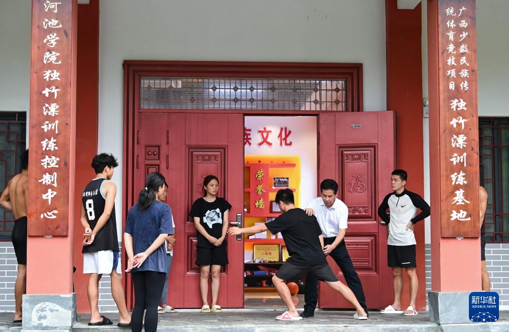 在位于廣西河池市的河池學院,該校體育學院院長藍建卓(右二)糾正獨竹漂隊隊員的技術動作(2024年6月19日攝)。