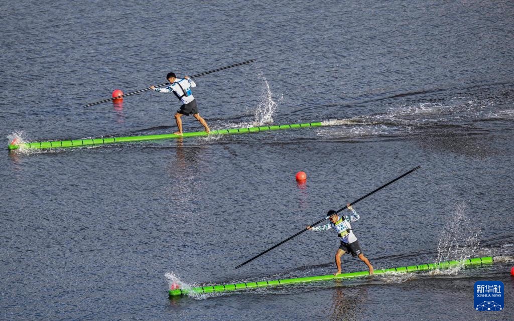11月27日,廣西隊選手黃適驥(下)、王光向在海南三亞舉行的第十二屆全國少數民族傳統體育運動會獨竹漂項目男子100米直道賽決賽中。最終黃適驥獲得一等獎、王光向獲得二等獎。