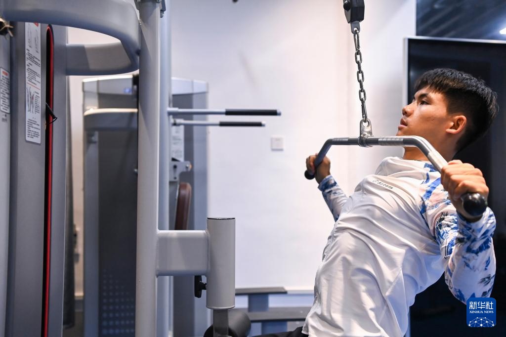 在廣西河池,河池學院獨竹漂隊隊員韋炳粵進行體能訓練(2024年11月14日攝)。