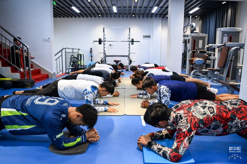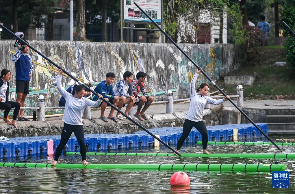 在廣西河池,河池學院獨竹漂隊的隊員們進行體能訓練(2024年11月14日攝)。