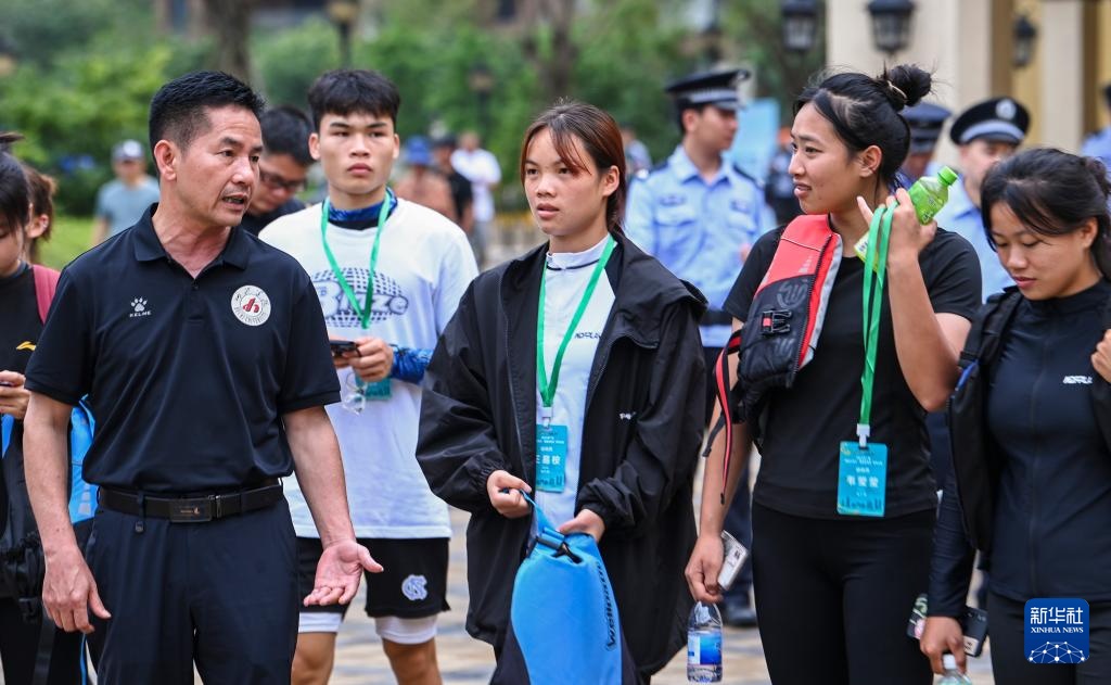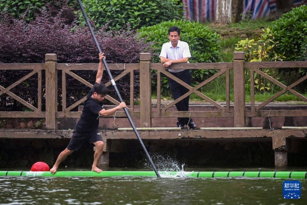 在位于廣西河池市的河池學院,該校體育學院院長藍建卓(右)觀看獨竹漂隊隊員的訓練。(2024年6月19日攝)。
