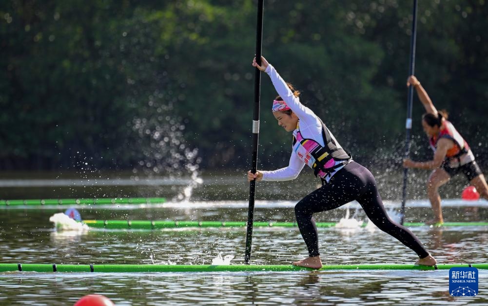 11月28日,廣西隊選手陸春桃(左)在海南三亞舉行的第十二屆全國少數民族傳統體育運動會獨竹漂項目女子組200米直道賽的比賽中。最終陸春桃獲得一等獎。