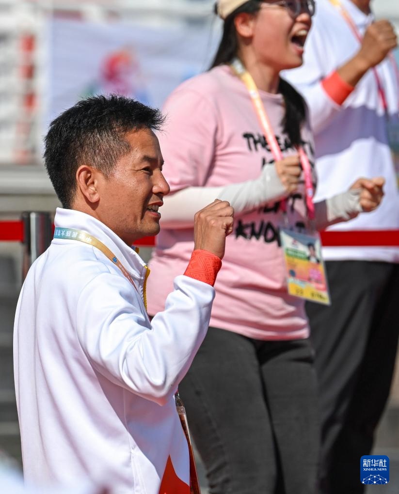 11月28日,廣西隊獨竹漂教練藍建卓(前)在海南三亞舉行的第十二屆全國少數民族傳統體育運動會獨竹漂項目比賽中為選手加油。