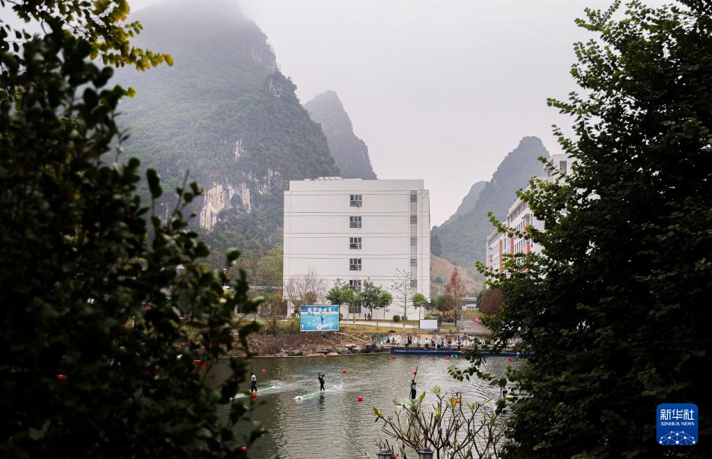 在廣西河池,河池學院的學生在校園內練習獨竹漂(2024年1月9日攝)。