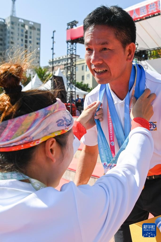 11月28日,在海南三亞舉行的第十二屆全國少數民族傳統體育運動會獨竹漂項目全部小項的比賽結束后,廣西隊獨竹漂選手陸春桃為教練藍建卓(右)戴上獎牌。