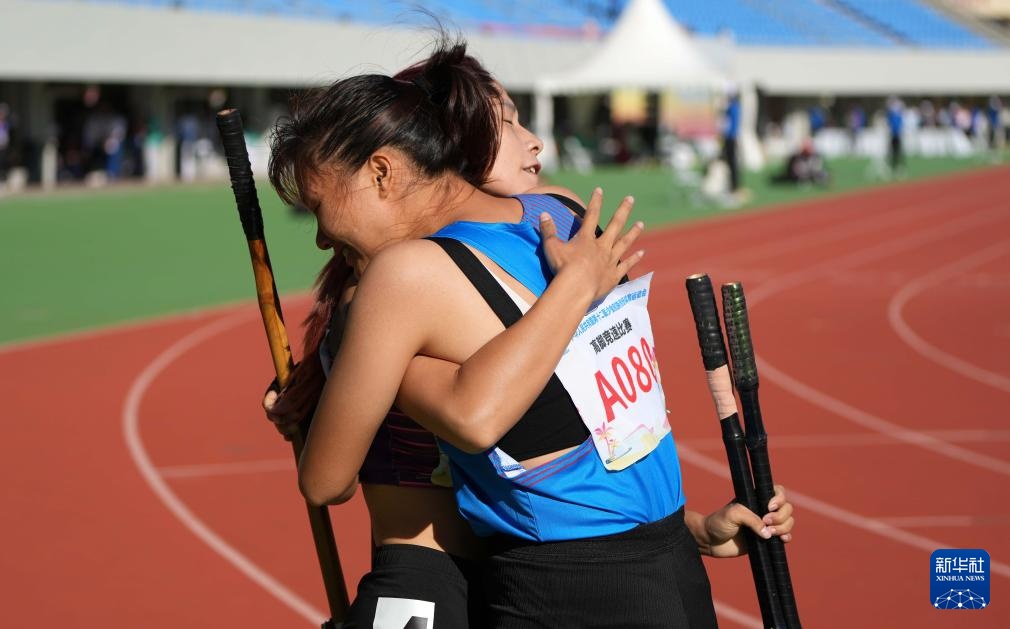 11月29日,海南隊選手吳妹娥(前)與湖南隊選手嚴美云在賽后擁抱。最終,吳妹娥獲得一等獎,嚴美云獲得二等獎。