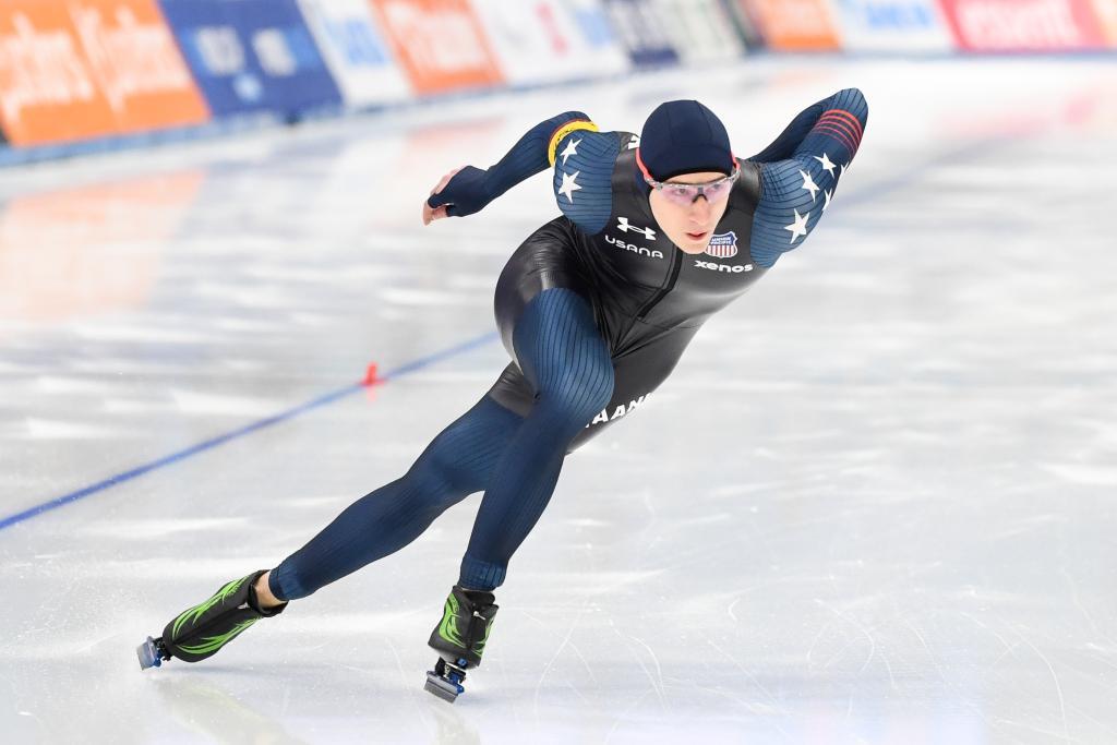 11月29日,美國選手斯托爾茲在比賽中。他以34秒27的成績獲得男子500米第一次比賽冠軍。新華社記者 鞠煥宗 攝