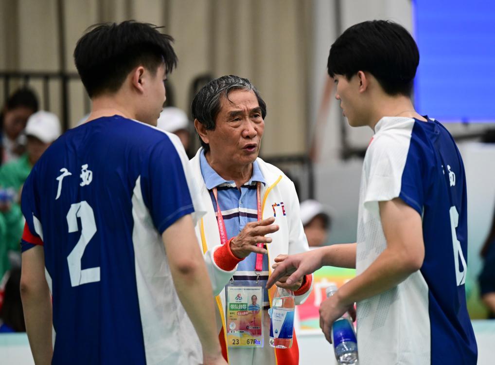11月28日,廣西隊組合古志胤(左)/左錚(右)在比賽間隙接受教練陸學仁的指導。他們獲得第十二屆全國少數民族傳統體育運動會毽球項目男子雙人賽一等獎。新華社記者 周牧 攝