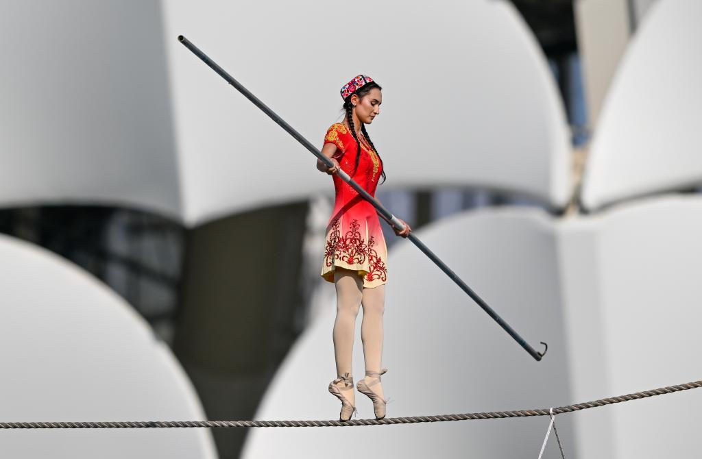 42年前,年僅11歲的阿迪力第一次參加運動會,默默看著師傅和前輩表演達瓦孜。今年他帶著團隊共同演繹的穿高跟鞋走鋼絲、蒙眼走鋼絲、鋼絲上跳舞、鋼絲上騎獨輪車等等成為全場焦點。