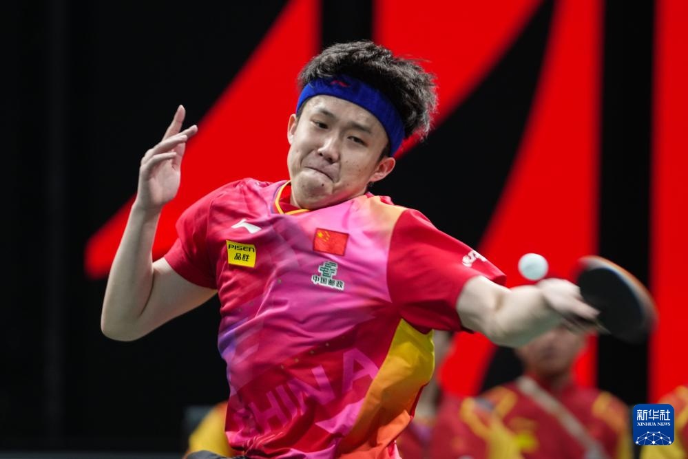 12月1日,中國隊選手王楚欽在男單比賽中回球。最終他2比0戰勝澳大利亞隊選手裴煥。