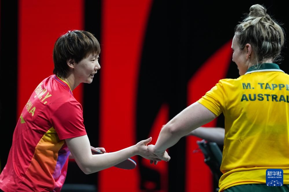 12月1日,中國隊選手王曼昱(左)與澳大利亞隊選手梅麗莎·泰普在女單比賽結束后握手。最終王曼昱3比0戰勝梅麗莎·泰普。