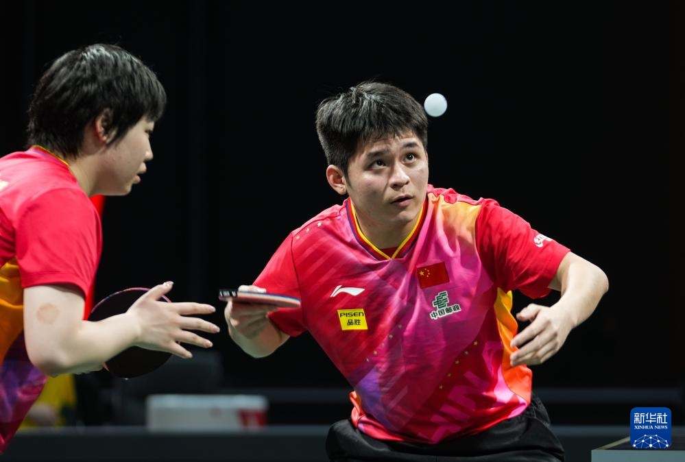 12月1日,中國隊組合林詩棟(右)/蒯曼在混雙比賽中。最終他們3比0戰勝澳大利亞隊組合盧偉/洪劍芳。
