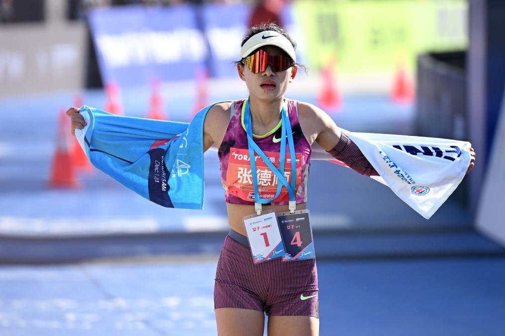 12月1日,中國選手張德順在2024上海馬拉松比賽后。最終,她獲得中國籍女子組冠軍。新華社發(陳浩明攝)