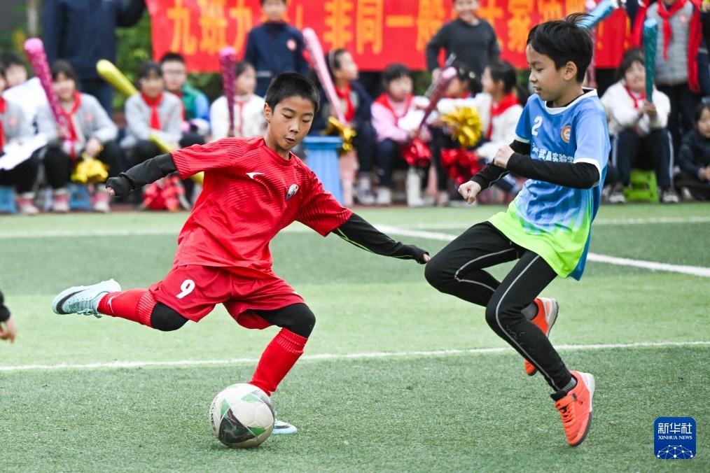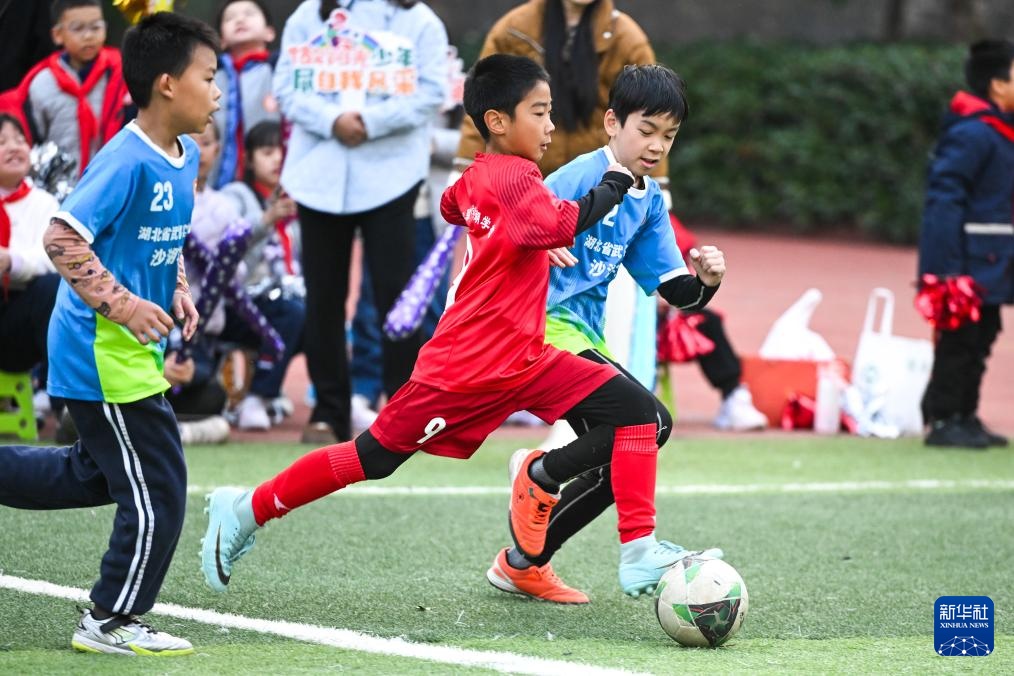 12月2日,湖北省武昌實驗中學沙湖學校學生在四年級組足球聯賽決賽中拼搶。