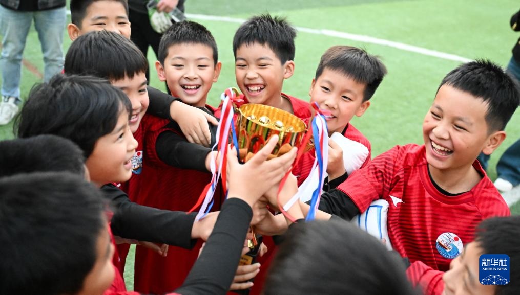 12月2日,湖北省武昌實驗中學沙湖學校學生在四年級組足球聯賽奪冠后慶祝。
