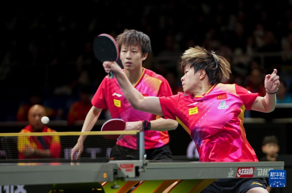 12月3日,中國隊組合王藝迪(右)/林高遠(yuǎn)在混雙比賽中。最終他們3比0戰(zhàn)勝美國隊組合南丹·納雷什/凱拉·古德溫。