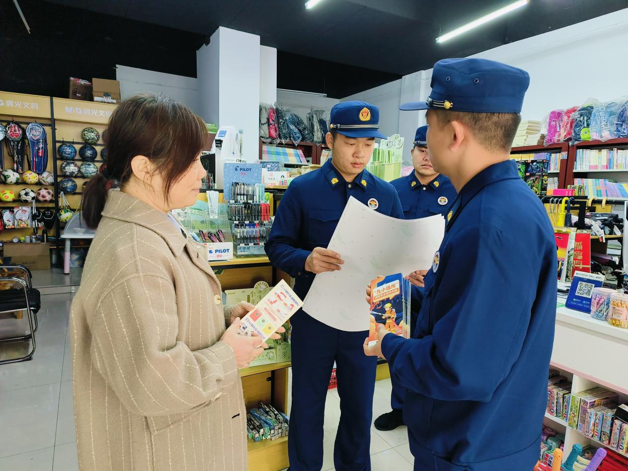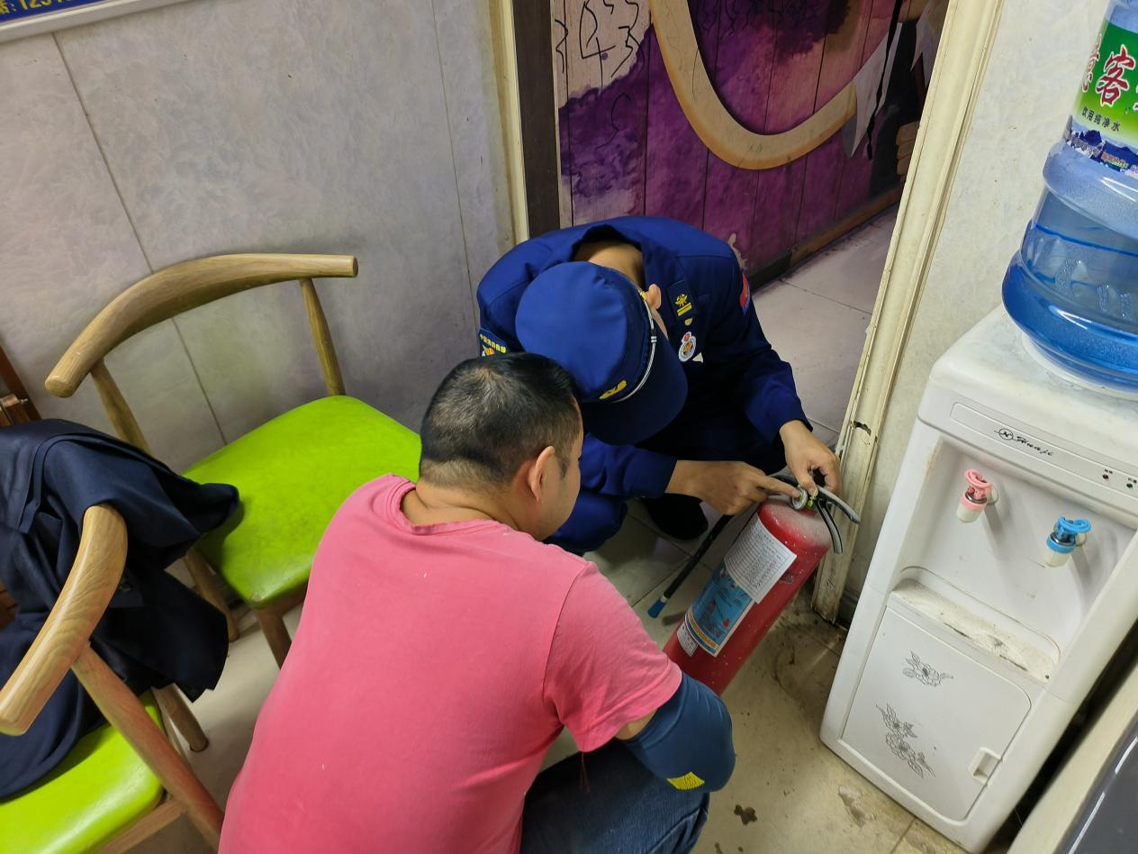 “你店內的滅火器數量不夠,一樓有三間鋪面,不應該只擺放一個滅火器”期間,“火焰藍”宣教隊還就活動中檢查出的電線私拉亂接、消防設施缺失或損壞等消防安全隱患進行現場指導,引導商戶立即整改,進一步提升沿街店鋪消防安全管理工作。