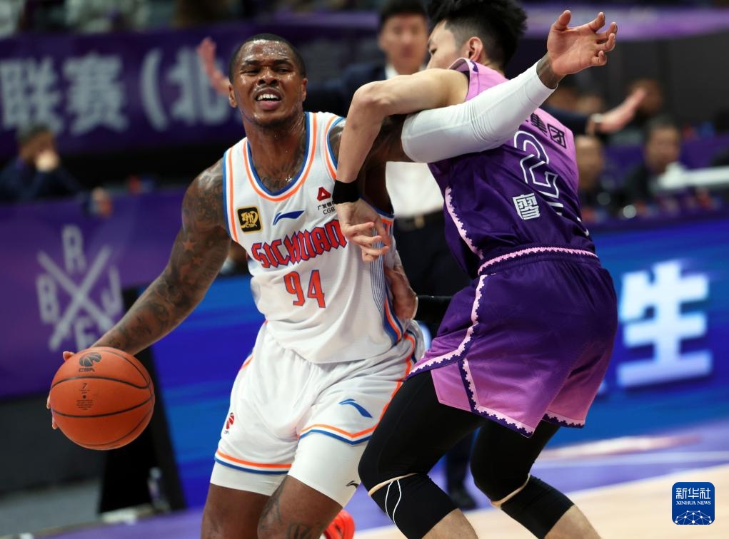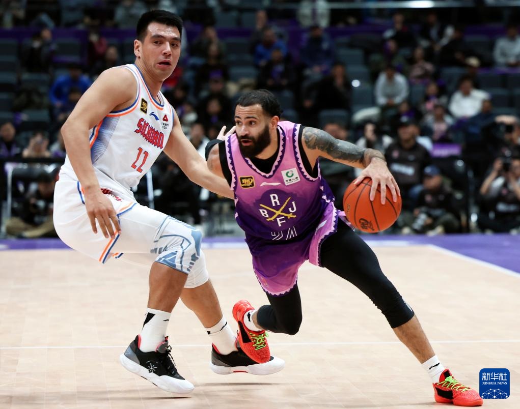 12月3日,四川豐谷酒業(yè)隊(duì)球員馬庫斯-亨特(左)突破受阻。