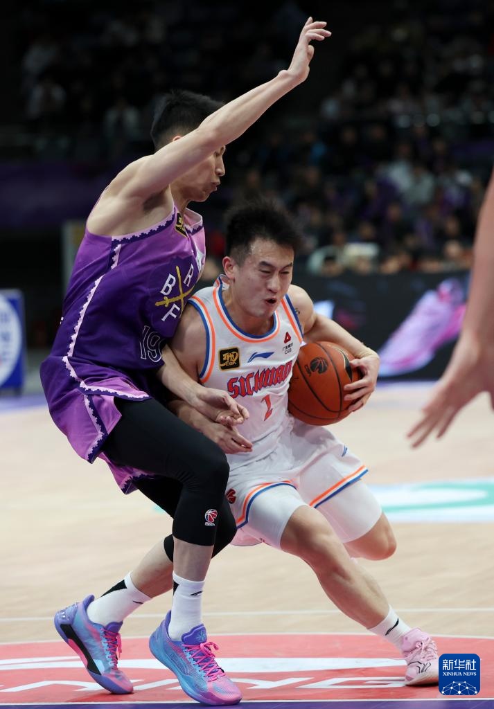 12月3日,四川豐谷酒業(yè)隊(duì)球員胡鈞淋(右)帶球突破。