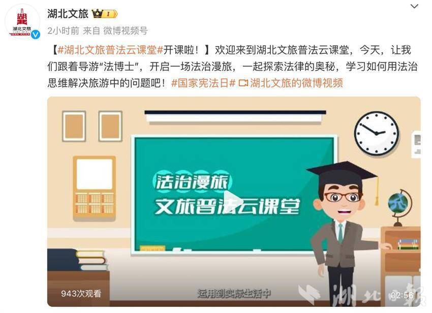 活動當天,在網上發布“湖北文旅普法云課堂”法治動漫科普視頻及系列科普海報,并在新媒體平臺開設#湖北文旅普法云課堂#網絡宣傳話題。