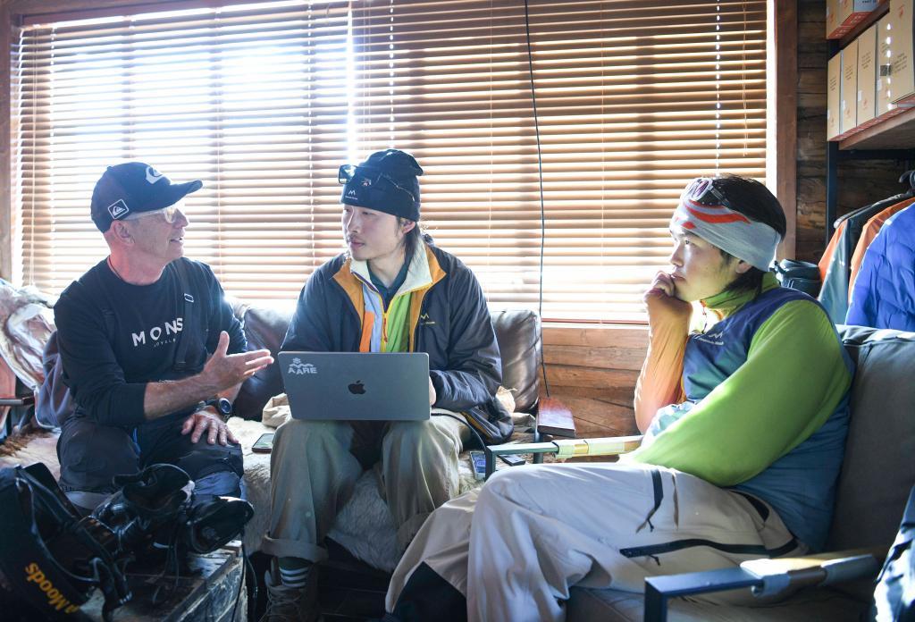 彭超(中)與好友彼得(左)在雪崩風險管理分享課上。新華社記者 胡虎虎 攝